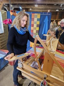 Die Weberin Nadia Reumann stellte ihr Handwerk im freilichtmuseum Molfsee vor und beantwortete Fragen zur Ausbildung und Zukunft handgewebter Stoffe.