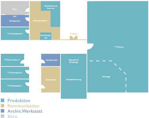 - Produktionsräume (Studios, Schnittplätze, MultimediaLab) grün