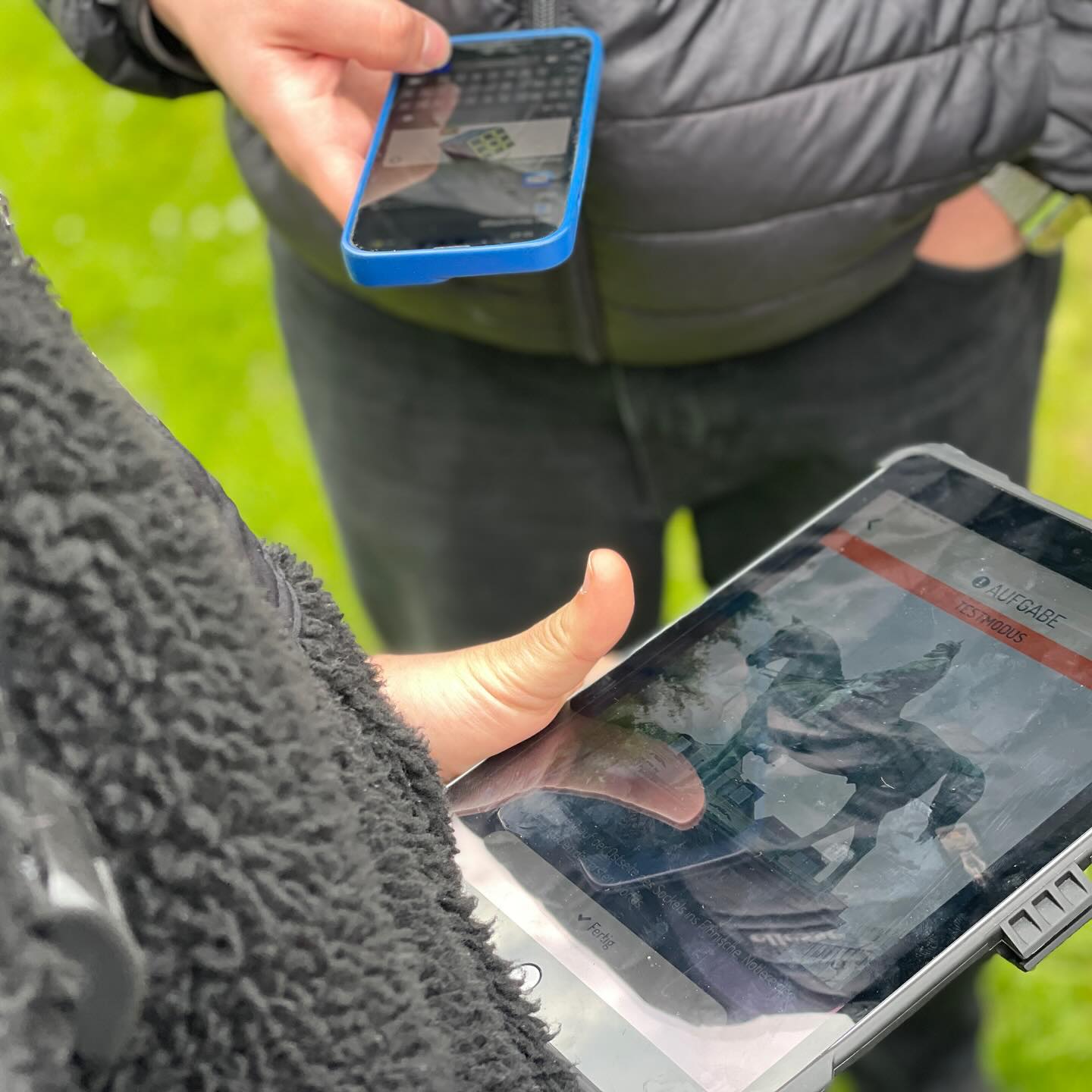 20 FSJler:innen der paritätischen Freiwilligendienste verbringen eine kreative Woche im OK Kiel. Sie produzieren mit der Technik vom OK Clips und Reels für den bundesweiten Aktionstag „Keine halben Sachen“. Heute waren sie mit Bjoern und Nils vom OK Flensburg digital und draußen unterwegs und hatten viel Spaß mit den Apps Actionbound, Active Arcade und AR Runner.