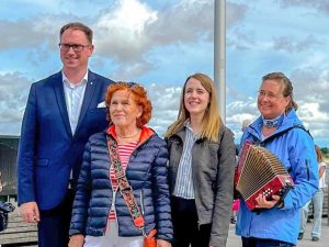 Inga Prasse hatte mit   Schüler:innen aus Lübeck und Travemünde Fahnen nach eigenen Entwürfen bemalt. Dieses FahnenMeer wurde jetzt durch unseren Bürgermeister Jan Lindenau und Marion Lemke-Stark vom »Verein für Kunst und Kultur zu Travemünde« (VKKT) an den Strandterassen feierlich eröffnet.