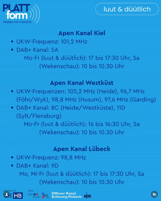 De PLATTform-Radiosennen „luut & düütlich“ kann dääglich över DAB+, UKW, de Livestreams vun den Offener Kanal Schleswig-Holstein or achteran online op uns Nettsteed höört warrn