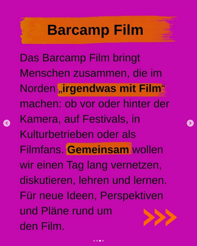 Das Barcamp Film bringt Menschen zusammen, die im Norden „irgendwas mit Film“ machen: ob vor oder hinter der Kamera, auf Festivals, in Kulturbetrieben oder als Filmfans. Gemeinsam wollen wir einen Tag lang vernetzen, diskutieren, lehren und lernen Für neue Ideen, Perspektiven und Pläne rund um den Film.